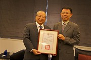 東吳大學潘維大校長(右)代表致贈感謝狀予顏文隆董事長(左)