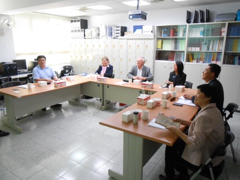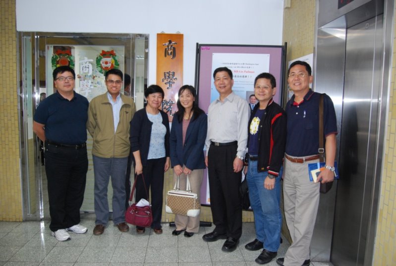 喬治華老師(右一)、林忠機主任(右二) 、詹乾隆院長(右三)、美國哥倫比亞大學 Lina Xu主任(右四)、莊聲和老師(左三)、詹芳書老師(左二) 、劉文彬老師(左一)。