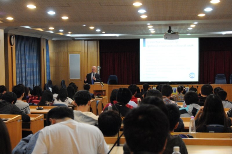 邱于芬老師(右一)、洪明欽老師(右二)、北美產險精算學會理事長 Robert Conger(右三)、北美產險精算學會香港代表 Michael Chou(左二)、喬治華老師(左一) 、詹芳書老師(後排右一) 、劉文彬老師(後排右二)及聽講學生。北美產險精算學會理事長 Robert Conger 演講