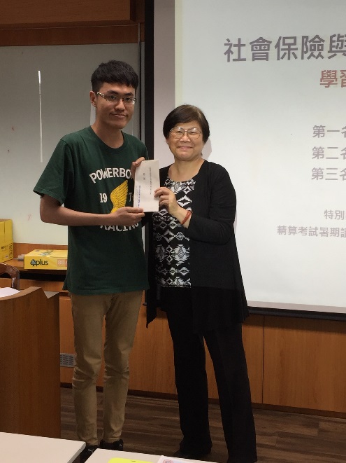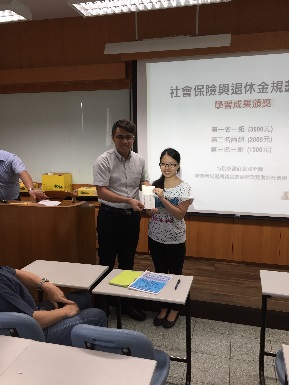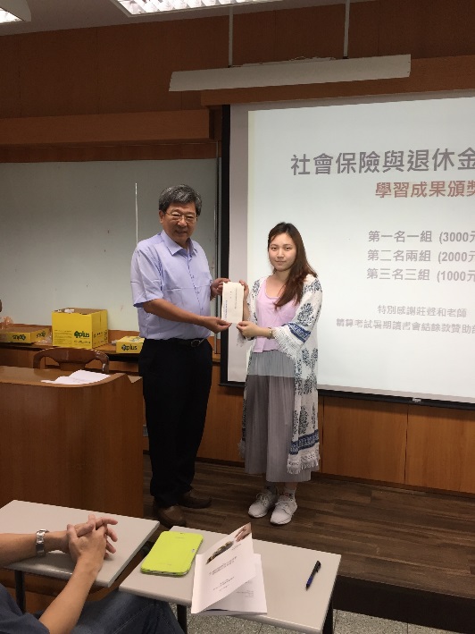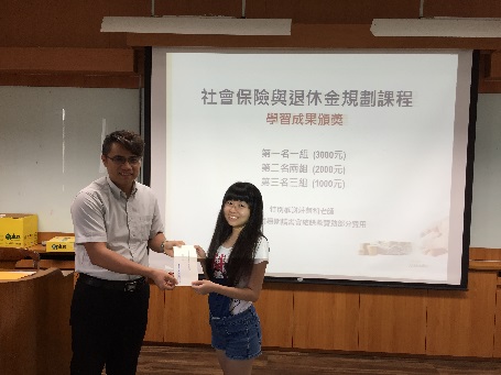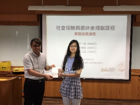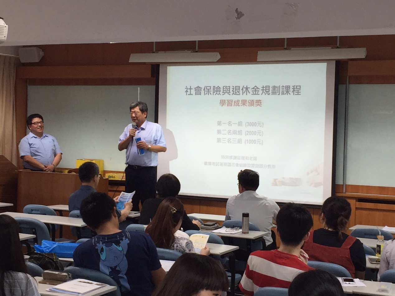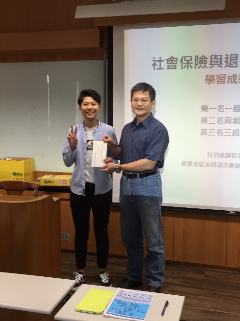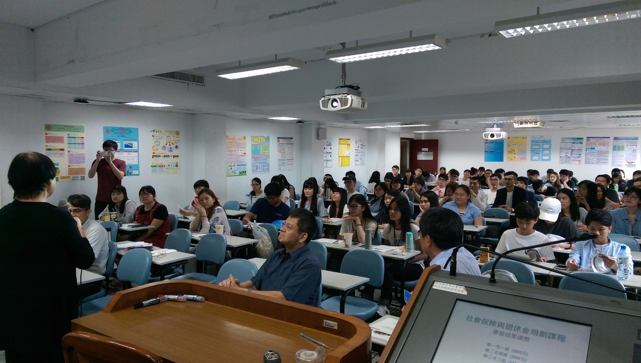 藉由課程設計,該課程於期末舉行學習成果競賽,共有16組同學組隊參賽,各組分別製作專題海報以及書面說明,並由本系碩士班精算組研究生擔任評審工作,期末成果發表於6月7日下午於城中校區2608教室舉辨,會中並邀請商學院傅祖壇院長、財精系林忠機主任、莊聲和老師以及詹芳書老師為前三名的組別頒獎。經過激烈的競爭,最後由財精三B的王乙安、田小妍、林子芳、吳馨語及鍾宜軒五位同學所製作的專題「小額終老保險」獲得第一名,由傅院長頒發獎金新台幣三千元以資獎勵。所有參賽組別的海報並公開展示於財精系辦公室前走廊,專題內容也集結成冊發給同學作為學習紀錄,希望同學都能在課程學習中對年金改革議題有正確的認識,並能提早對自己的退休生活進行規劃。