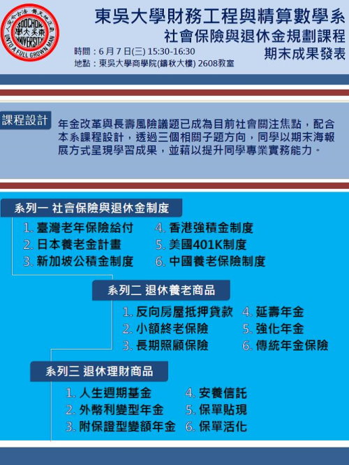 由於臺灣人口結構將於民國107年正式邁入高齡化社會,因此個人退休規劃與政府年金改革議題已成為目前社會關注的焦點,東吳大學財務工程與精算數學系於105學年第二學期增加開設「社會保險與退休金規劃」選修課程,一方面介紹各種社會保險制度(例如:勞工保險、公務人員保險及國民年金保險)以及職業退休給付(例如勞工退休條例(舊制與新制)與公務人員退休撫卹制度),另外也介紹各種商業養老商品(例如:反向房屋抵押貸款、小額終老保險、長期照顧保險、延壽年金與強化年金)與退休理財商品(例如:人生週期基金、外幣利變型年金、安養信託、保單貼現與保單活化),協助同學學習相關退休制度與商品的基本觀念,並藉以提升相關專業實務能力。