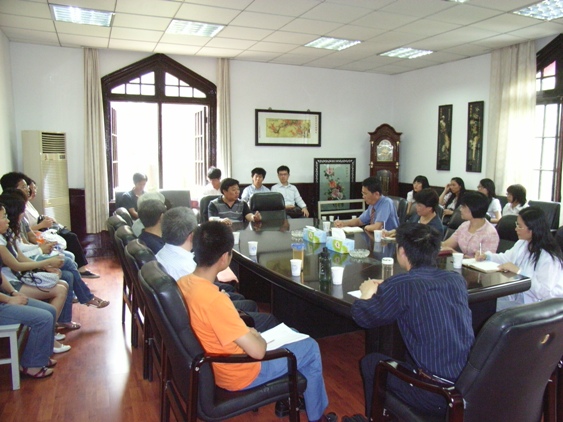 在紅樓三樓的會議室中,一行人與蘇州大學數學科學學院陳敏副院長、王岳宝主任、王過京教授以及博碩士研究生座談。針對兩系的發展與教學作一深入的介紹與交流,並在老師的研究領域及學生的畢業出路上進行心得交換與見解的交流。中午由陳敏副院長作東招待我們,餐後隨即啟程回上海,直至夜幕低垂,方返抵復旦燕園賓館下榻。