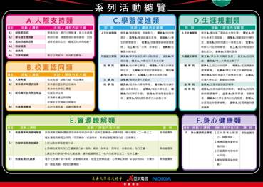 圖1:課程活動的六大分類其中由學務處、教務處主責辦理之「人際支持類」、「校園認同類」、「資源瞭解類」及「身心健康類」等活動,主要協助新生熟悉校園環境及各項資源,瞭解大學生的角色及發展任務,並學習自我健康及情緒的管理。其次,由全校各學系分別規劃的課程,則是由學系邀請導師、專業教師、優秀學長姐分享成功的學習典範及生涯規劃,協導新生掌握學習要領,促進學習成效,相關課程活動總覽如圖2。
