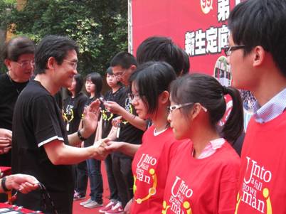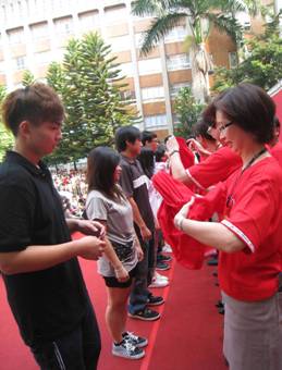 首先是由各學系主任及亞太電信北區營運副總經理蔡福原學長,共同發給每位新生東吳99紀念衫。紀念衫以象徵東吳人熱情與堅毅的紅、黑校色製成,並以英文校訓「Unto to a full grown man」為主題設計,期勉新鮮人傳承東吳精神。