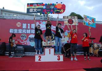 圖7、8:創意班呼競賽、10人11腳競賽頒獎本次活動經調查參加者回饋意見後,整體滿意度達4.0(5分量表),相當多數同學透過質性回饋意見,具體表達對學校、老師及學長姐的感謝,也表示充分感受到學校對新生的重視,對開展自我大學生涯充滿希望與熱情。此外,針對部分同學提出對於註冊選課流程、網路使用與承載、校園餐點安排及辦理天數等改進建議,均將納入考量進行檢討,以為明年改善參考。誠如本次第1哩新生定向輔導活動的總體目標,希望新生邁入東吳後之大學生涯,都能成功學習、學習成功!